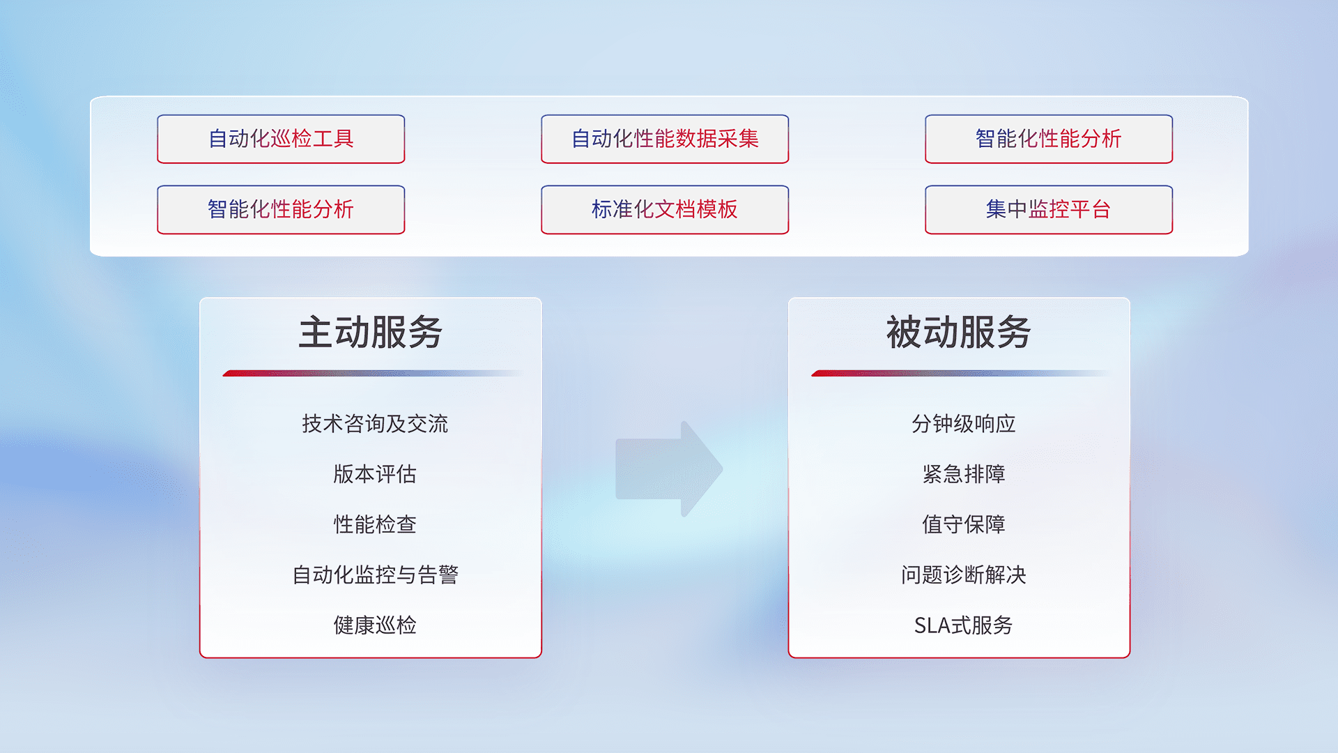 智能化工具和标准化文档,,,,保障服务质量,,提供主动服务(包含技术咨询、、、、版本评估、、、性能检查、、自动化监控与告警、、、、健康巡检)和被动服务包含(分钟级响应、、紧急排障、、、、值守保障、、问题诊断解决、、SLA服务)。。。
