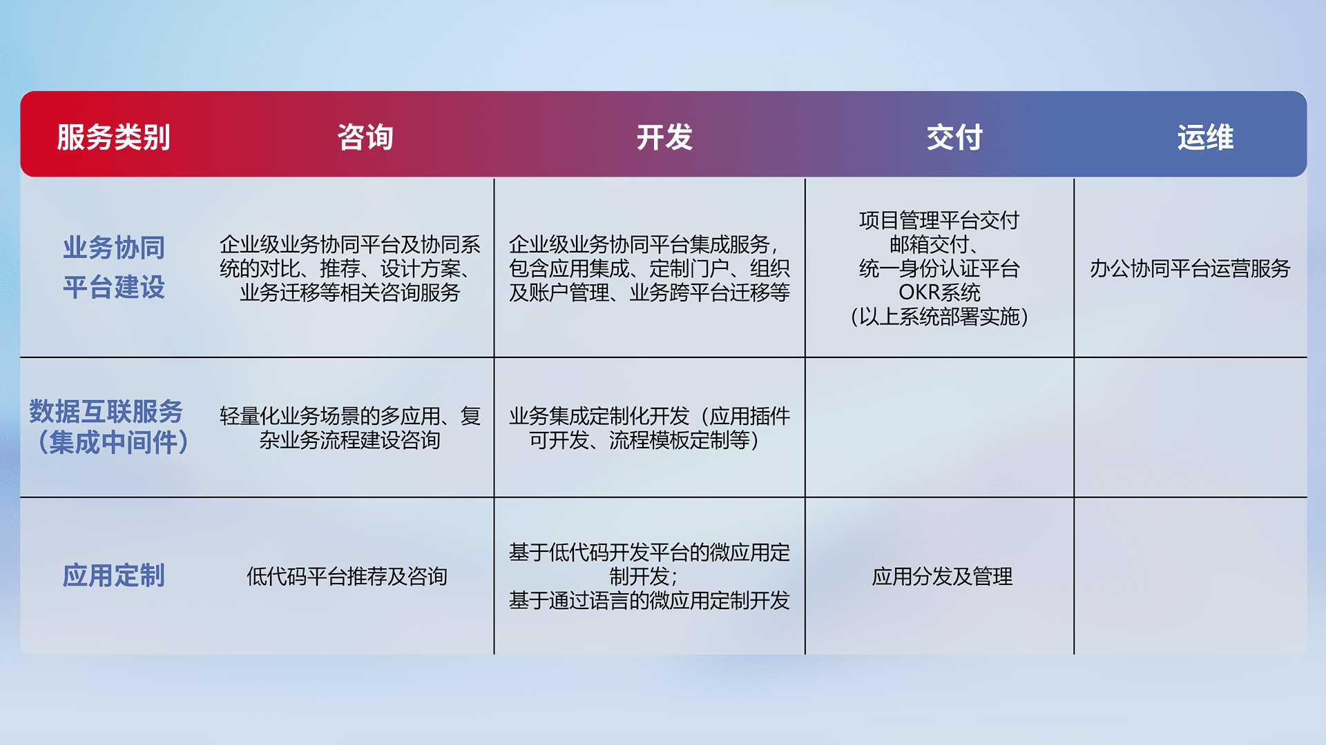 针对钉钉、、、企微、、、IDaas等平台级产品提供产品的规划、、方案、、交付、、定制化开发等服务,,实现如统一协同办公、、、、智能客户服务、、、、混合会议管理、、、、智能数据查询、、、等业务场景,,,实现数字化转型。。。